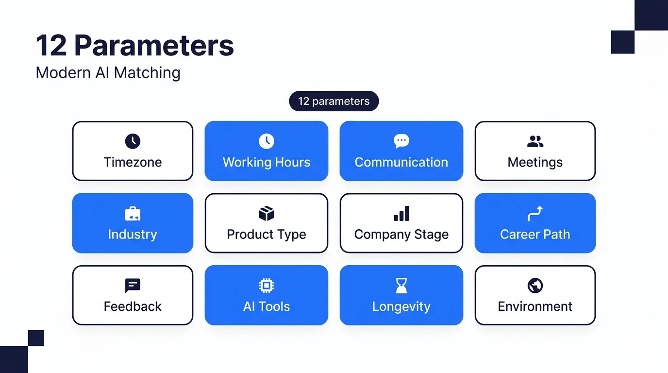 Twelve parameters predict developer hiring success beyond raw technical skills. They cover working rhythm, context depth, career alignment, and environment. Modern AI matching tools should measure all of them. Most still measure two or three at best, and that is why so many good hires still turn into disappointing outcomes.