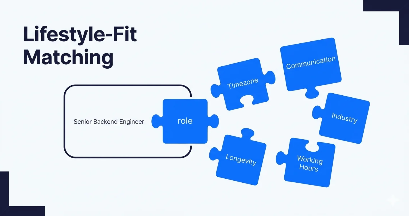 Lifestyle-fit matching is the practice of pairing a developer to a role using behavioral, contextual, and lifestyle parameters alongside technical skills. Instead of asking "does this candidate know React?" the matching system also asks: Do they work the hours my team actually collaborates in? Do they communicate the way my team communicates? Have they shipped in my industry? Will they still be here in 18 months?